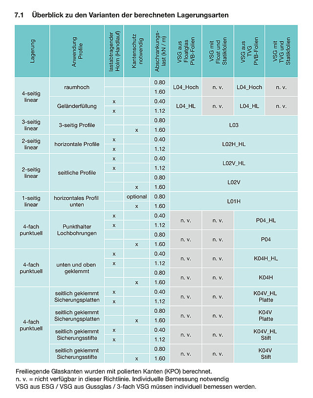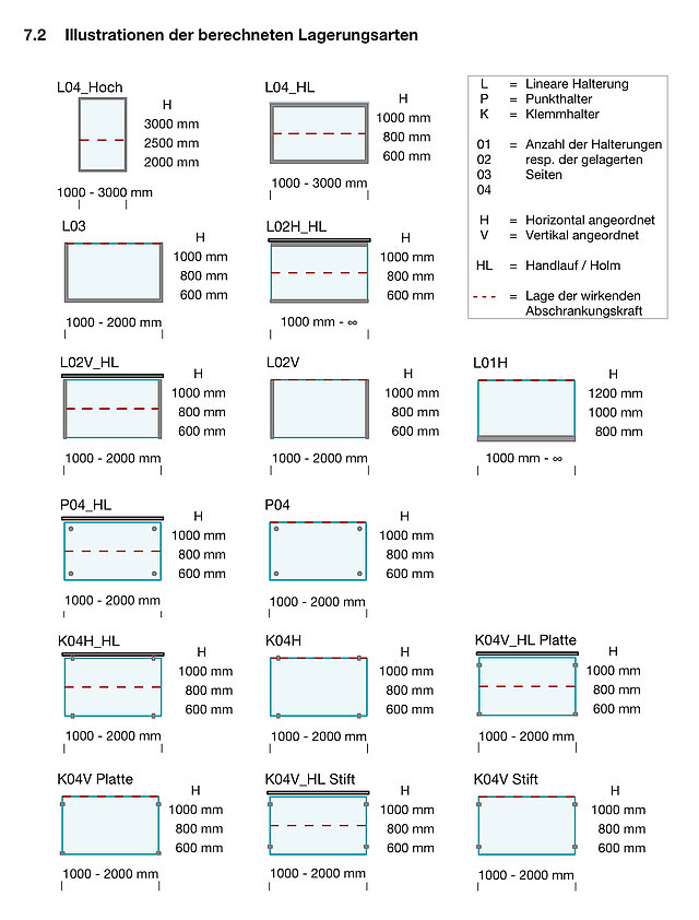 Die SIGAB hat mit der Richtlinie 004 «Geländer aus Glas - Dimensionierung von Glasdicken» (SR-004, 2024) ein Werk herausgegeben, aus dem die Glasdicken und Glaskombinationen für einen Grossteil der Glasgeländer, sowohl für Holmlasten von 0,8 kN/lfm für Wohn- und Büroflächen als auch für Holmlasten von 1,6 kN/lfm bei Versammlungsflächen (ohne Menschengedränge), abgelesen werden können. Die Windlasten wurden entsprechend der Systematik dieser Richtlinie in Abhängigkeit von Grundstaudruck und Gebäudehöhe in Gruppen gegliedert und decken einen Bereich von 0.4 kN/m2 (Innenanwendung) bis 2.2 kN/m2 (Grundstaudruck von 1.3 kN/m2 auf dem Dach eines 5-geschossigen Gebäudes) ab. Die Planung nach den Rahmenbedingungen der SR-004 ermöglicht es, den entsprechenden statischen Nachweis für die Ausführung zu erbringen. Es wurden Verbund-Sicherheitsgläser (VSG) aus 2 x Floatglas und aus 2 x teilvorgespanntem Glas (TVG), sowohl mit Polyvinylbutyral (PVB) als auch mit schubsteifen Zwischenlagen (Ionomer) dargestellt. Folgende Lagerungsarten wurden darin berücksichtigt:
